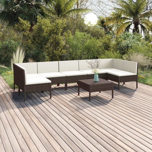 Dieses Poly Rattan Sofa-Set, bestehend aus 2 Sofa-Eckelementen, 4 Sofa-Mittelstücken, 1 Couchtisch, 1 Ottomane, 8 Rückenpolstern und 7 Sitzpolstern...