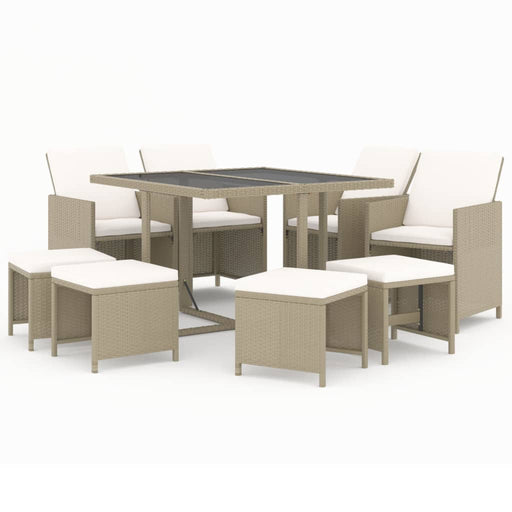 Diese elegante 8-Personen-Essgruppe aus Rattan besteht aus 1 Tisch, 4 Stühlen, 4 Hockern, 8 abnehmbaren Sitzkissen und 4 Rückenkissen. Das Rattan-M...