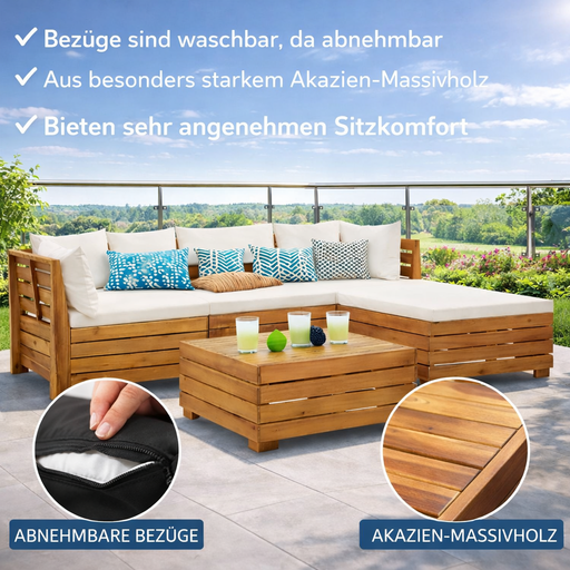 Beschreibung Dieses Lounge-Set aus Holz stellt eine perfekte Kombination aus Stil und Funktionalität dar. Auf dieser Sitzgruppe können Sie entspann...