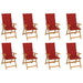 Dieses stilvolle Gartenstuhl-Set mit Kissen ist aus Teakholz gefertigt und ist eine große Bereicherung für Ihren Garten oder Ihre Terrasse und lädt zum netten Plaudern mit der Familie und Freunden ein. Zudem können Sie auf diesen Gartenstühlen das wohlig warme Wetter genießen. Der klappbare Liegestuhl aus Holz weist ein klassisches Design auf. Das für diese Teakmöbel verwendete Teakholz ist technisch getrocknet und anschließend fein geschliffen worden, um ein sehr glattes Erscheinungsbild zu erhalten. Teak ist für seine außergewöhnliche Festigkeit und Witterungsbeständigkeit geschätzt und eignet sich daher weitaus besser für Gartenmöbel als jede andere Holzart. Teakholz ist die perfekte Wahl, wenn Sie sich langlebige Gartenmöbel anschaffen möchten. Die Rückenlehne des Sessels lässt sich in 7 Einstellungen verstellen, sodass Sie immer die bequemste Position finden. Es ist außerdem leichtgewichtig, wodurch es einfach zu umstellen ist. Der Esszimmerstuhl kann bei Nichtgebrauch platzsparend zusammengeklappt werden. Darüber hinaus sorgen die im Lieferumfang enthalten Kissen für zusätzlichen Komfort. Jede Auflage hat ein Gummiband und zwei Bänder-Sets, um es fest am Stuhl zu befestigen. Hinweis: Um die Lebensdauer Ihrer Gartenmöbel zu verlängern, empfehlen wir Ihnen, diese regelmäßig zu reinigen und bei Nichtgebrauch im Freien abzudecken.Reinigung: Verwenden Sie eine milde SeifenlösungLagerung: Wenn möglich, an einem kühlen, trockenen Ort im Innenbereich lagern. Wenn das Produkt im Freien gelagert wird, schützen Sie es mit einer wasserdichten Abdeckung. Wischen und trocknen Sie das überschüssige Wasser oder den Schnee nach Regen oder Schneefall von der ebenen Fläche. Sorgen Sie für eine ausreichende Luftzirkulation, um feuchtigkeitsbedingte Schäden zu vermeiden.