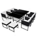 Diese elegante 10-Personen-Essgruppe aus Rattan besteht aus 1 Tisch, 6 Stühlen, 4 Hockern, 10 abnehmbaren Sitzkissen und 6 Rückenkissen. Das Rattan-Möbel-Set für den Außenbereich wird der Blickfang in deinem Garten oder auf der Terrasse sein! Das pulverbeschichtete Stahlgestell macht den Tisch und die Stühle stabil und robust, und dank der leichten Konstruktion lassen sich alle Möbelstücke leicht umstellen. Dank des witterungsbeständigen und wasserfesten PE-Rattans ist das Esstisch-Set pflegeleicht. Die Tischplatte aus gehärtetem Glas ist mit einem feuchten Tuch leicht zu reinigen. Die dicken, weichen Kissen mit Baumwollfaserfüllung sind sehr bequem. Die abnehmbaren und waschbaren Bezüge sind mit Reißverschlüssen versehen. Wenn nicht benutzt, lassen sich die Stühle und Hocker platzsparend unter dem Tisch verstauen. Hinweis: Wir empfehlen, das Set bei Regen, Schnee oder Frost abzudecken.