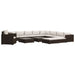 Diese Rattan-Gartensofagarnitur vereint Stil und Funktionalität und wird zum Hingucker in Ihrem Garten oder auf der Terrasse sein. Das gesamte Möbel-Set ist für die ganzjährige Nutzung im Freien vorgesehen. Dank des witterungsbeständigen und wasserdichten PE-Rattans ist das Lounge-Set pflegeleicht, strapazierfähig und für den täglichen Gebrauch bestens geeignet. Das Gartensofa-Set verfügt über einen stabilen, pulverbeschichteten Stahlrahmen, der extrem langlebig ist. Die leichtgewichtige und modulare Bauweise macht es möglich, dass Sie die Sitzgruppe, passend zu den Platzverhältnissen vor Ort, immer wieder neu aufstellen bzw. umstellen. Die dick gepolsterten, abnehmbaren Kissen sorgen für hohen Sitzkomfort. Im Lieferumfang enthalten sind 3 Ecksofas, 5 Mittelsofas, 2 Fußstützen, 1 Sessel, 2 Couchtische, 11 Sitzkissen und 12 Rückenkissen. Hinweis: Wir empfehlen Ihnen, das Set bei Regen, Schnee und Frost abzudecken.