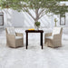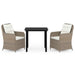 Genießen Sie eine angenehme Mahlzeit oder Ihren Nachmittagstee in Ihrem Außenbereich an dieser Garten-Essgruppe! Mit ihrem eleganten Design wird sie ein echter Hingucker in Ihrem Garten oder auf Ihrer Terrasse sein! Mit einem Stahlrahmen versehen, ist diese praktische Outdoor-Essgruppe robust und stabil. Die Gartenstühle bestehen aus wasserbeständigem und pflegeleichtem PE-Rattan und eignen sich daher perfekt für den Einsatz im Außenbereich. Die ergonomisch gestaltete Form und die dick gepolsterten, abnehmbaren Kissen mit Füllung aus Schaumstoff sorgen für höchsten Sitzkomfort. Die pflegeleichten Kissenbezüge aus Polyester können einfach abgenommen und gewaschen werden. Zudem lässt sich die glatte Tischplatte aus Glas mit einem feuchten Tuch einfach reinigen und bietet einen ausgezeichneten Platz für Speisen, Getränke und verschiedene Dekoartikel. Hinweis: Um die Lebensdauer deiner Gartenmöbel zu verlängern, empfehlen wir dir, sie mit einer wasserdichten Abdeckung zu schützen.