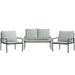 Mit seinem eleganten und modernen Design ist dieses trendige Garten-Lounge-Set eine großartige Wahl zum Entspannen in deinem Garten. Langlebiges Material: Textilene lässt die Luft frei durchströmen und ist resistent gegen UV-Strahlen. Dadurch ist Textilene eine ideale Wahl für heißes Wetter. Als langlebiges und strapazierfähiges Material ist es sehr widerstandsfähig gegen Risse, Durchstiche und Schimmelbildung.Robuster und stabiler Rahmen: Die Stahlrahmen machen das Lounge-Set robust und stabil und somit für den täglichen Gebrauch im Freien bestens geeignet.Bequemes Sitzerlebnis: Die Rückenlehnen und Armlehnen sorgen für zusätzlichen Sitzkomfort der Stühle und der Bank. Außerdem sorgen die dick gepolsterten Kissen für Komfort beim Sitzen. Hinweis:Damit deine Gartenmöbel lange schön bleiben, empfehlen wir dir, sie mit einer wasserdichten Hülle zu schützen.