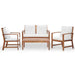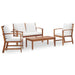 Die Garten-Sofagarnitur ist die perfekte Wahl zum Kaffeetrinken oder Faulenzen. Das Lounge-Set strahlt einen rustikalen Charme aus und wird Ihrem Garten oder Ihre Terrasse Stil und Eleganz verleihen. Dieses Gartenmöbel-Set ist aus Akazienholz, einem Tropenholz, das witterungsbeständig und sehr langlebig ist, gefertigt. Dank der Öllackierung hat das Terrassenmöbel-Set eine warme Farbe und ist pflegeleicht. Die mitgelieferten Sitz- und Rückenkissen bieten zusätzlichen Komfort. Die Lieferung umfasst 1 Tisch, 1 Bank, 2 Stühle, 4 Sitzkissen und 4 Rückenkissen. Die Gartenmöbel müssen montiert werden.