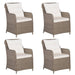 Schaffen Sie mit dieser Garten-Essgruppe eine überzeugende und zusammenhängende Ästhetik in Ihrem Außenbereich! Der Gartentisch ist aus massivem Akazienholz gefertigt, was ihn robust und stabil macht. Durch die mit Öl behandelte Oberfläche lässt sich der Tisch zudem mit einem feuchten Tuch leicht reinigen. Darüber hinaus tragen die geschwungenen Beine zu seinem stilvollen Design bei. Mit einem Stahlrahmen versehen, der mit wetterfestem PE-Rattan überzogen ist, sind die Essstühle robust und leicht zu reinigen. Jeder Stuhl wird mit dick gepolsterten Kissen geliefert, die für zusätzlichen Komfort beim Entspannen sorgen. Hinweis: Um die Lebensdauer Ihrer Gartenmöbel zu verlängern, empfehlen wir Ihnen, diese regelmäßig zu reinigen und bei Nichtgebrauch im Freien abzudecken.Reinigung: Verwenden Sie eine milde SeifenlösungLagerung: Wenn möglich, an einem kühlen, trockenen Ort im Innenbereich lagern. Wenn das Produkt im Freien gelagert wird, schützen Sie es mit einer wasserdichten Abdeckung. Wischen und trocknen Sie das überschüssige Wasser oder den Schnee nach Regen oder Schneefall von der ebenen Fläche. Sorgen Sie für eine ausreichende Luftzirkulation, um feuchtigkeitsbedingte Schäden zu vermeiden.