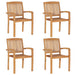 Verleihe deinem Esszimmer, deinem Garten oder deiner Terrasse einen Hauch von rustikalem Charme mit dieser Essgruppe! Massives Teakholz: Massives Teakholz ist ein wunderschönes Naturmaterial. Es wurde abgelagert, getrocknet und anschließend fein geschliffen, um eine sehr glatte Optik und Haptik zu erhalten. Teakholz ist für seine außergewöhnliche Festigkeit und Witterungsbeständigkeit bekannt.Stabiler Rahmen: Die Holzrahmen sorgen für Robustheit und Stabilität, so dass diese Essgruppe die perfekte Wahl ist, wenn du ein langlebiges Gartenmöbel kaufen möchtest.Stapelbarer Stuhl: Die Stühle können gestapelt werden, um bei Nichtgebrauch Platz zu sparen. Hinweis:Um die Lebensdauer deiner Gartenmöbel zu verlängern, empfehlen wir dir, sie mit einer wasserdichten Hülle zu schützen.