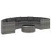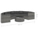 Dieses stilvolle, halbrunde Garten-Lounge-Set wird ein echter Hingucker in Ihrem Garten, auf Ihrer Terrasse bzw. auf Ihrem Balkon sein. Aus PE-Ratten gefertigt, lässt sich diese Garten-Sofagarnitur das ganze Jahr über im Freien verwenden. Die pulverbeschichteten Stahlrahmen gewährleistet hohe Stabilität und eine lange Lebensdauer. Dank des wetterbeständigen und wasserdichten PE-Rattans lässt sich das Sofa ganz einfach reinigen. Die dicken, weichen Kissen und Auflagen aus wasserabweisendem Polyester bieten höchsten Sitzkomfort. Darüber hinaus sind deren Bezüge mit Reißverschlüssen ausgestattet, abnehmbar und leicht waschbar. Das Garten-Möbelset überzeugt durch sein elegantes Design, seine hervorragende Ästhetik und hohe Haltbarkeit. Hinweis: Wir empfehlen, das Set bei Regen, Schnee und Frost abzudecken.