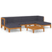 Dieses Garten-Lounge-Set kombiniert Stil und Funktionalität und ist die ideale Wahl, um sich zu entspannen und das Wetter zu genießen, ein Nickerchen zu machen oder mit Ihrer Familie oder Freunden zu plaudern. Aus massivem Akazienholz gefertigt, ist dieses Gartenmöbel-Set pflegeleicht, strapazierfähig und alltagstauglich. Das Möbel-Set hat eine solide Konstruktion und benötigt wenig Wartung. Der Tisch ist ideal, um Speisen und Getränke griffbereit aufzubewahren. Dank des Bezugs aus 100% Polyester und der dicken Polsterung sind die mitgelieferten Kissen weich und bieten höchsten Komfort. Dieses Lounge-Set ist außerdem leicht und modular, wodurch es vollständig flexibel und leicht an jede Umgebung angepasst werden kann. Sie können es mit anderen modularen Sofa-Elementen kombinieren, um Ihre persönlichen Garten-Lounge-Set-Konfigurationen zu erstellen! Hinweis: Um die Lebensdauer Ihrer Gartenmöbel zu verlängern, empfehlen wir Ihnen, diese regelmäßig zu reinigen und im Freien vor Niederschlägen oder starken Sonnenstrahlen zu schützen.Reinigung: Verwenden Sie eine milde Seifenlösung.Lagerung: Wenn möglich, an einem kühlen, trockenen Ort im Innenbereich lagern. Wenn das Produkt im Freien gelagert wird, schützen Sie es mit einer wasserdichten Abdeckung. Wischen und trocknen Sie das überschüssige Wasser oder den Schnee nach Regen oder Schneefall von ebenen Flächen. Sorgen Sie für eine ausreichende Luftzirkulation, um feuchtigkeitsbedingte Schäden zu vermeiden.
