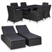 Dieses luxuriöse Essgruppe aus Poly Rattan weist ein elegantes Design auf und wird mit Sicherheit der Mittelpunkt Ihres Gartens oder Ihrer Terrasse sein! Die pulverbeschichteten Stahlrahmen machen den Tisch und die Stühle stabil und robust und dank ihrer Leichtbauweise lassen sich alle Möbelteile auch einfach umstellen. Die 2 Sonnenliegen sind eine hervorragende Wahl zum Entspannen im Garten oder am Pool. Aus wetterbeständigem und wasserdichtem Poly Rattan gefertigt, ist die Essgruppe leicht zu reinigen. Die dick gepolsterten, weichen Auflagen und Rückenkissen sind äußerst komfortabel. Die pflegeleichten Polyester-Bezüge mit verdeckten Reißverschlüssen können abgenommen und gewaschen werden. Hinweis: Wir empfehlen, das Set bei Regen, Schnee oder Frost abzudecken.