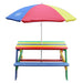 An diesem Picknicktisch aus Holz wird Ihr Kind ohne Zweifel einen verspielten Nachmittag genießen! Dieser Nick Picknicktisch in Regenbogenfarben von Axi ist mit einem Sonnenschirm versehen und eine ideale Wahl zum Picknicken mit Kindern und Spielen im Freien. Wenn die Sonne zu scheinen beginnt, finden die Kinder Schutz unter dem höhenverstellbaren Sonnenschirm. Dieser Picknicktisch besticht durch seine fröhlichen Regenbogenfarben und passt gut zu jedem Garten. Er bietet Platz für bis zu vier Kinder. Auf diese Weise können sie zusammen basteln, zeichnen oder Leckereien genießen. Die Sitzhöhe beträgt 26,7 cm vom Boden. Schaffen Sie also ein lustiges und interessantes Plätzchen für Ihren Kleinen im Garten oder auf der Terrasse mit diesem Picknicktisch mit Bänken auf beiden Seiten!